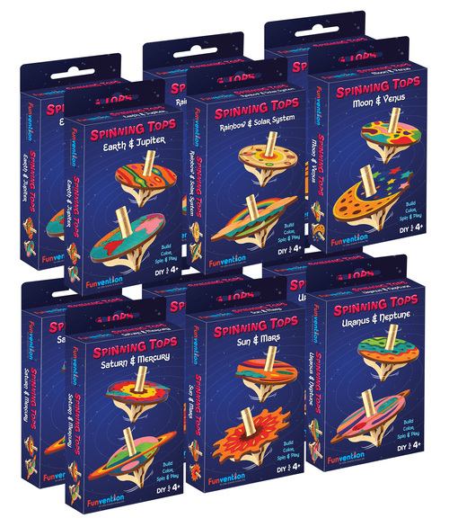 Build, Paint & Play your own Spinning Tops - 6 unique shapes of Earth, Rainbow, Sun, Moon, Saturn & Asteroid come with common shape of Solar System