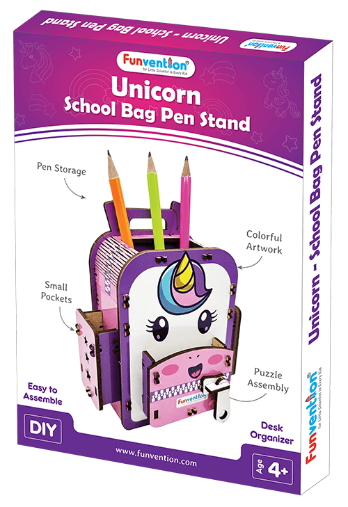 | Funvention - A Startup with a Mission, to engage your kids with Fun + Invention. We conceptualise, design & develop an Innovative DIY Educational toys which provide a platform for children's to hands-on experience in building creative toys with the learning of basic working principle behind it. Funvention proudly presents "3D Colourful Unicorn School Bag Models” in DIY Pen Stand segments. It is a DIY 3D model which kids can build themselves and use as desk organiser or pen/pencil stand. This DIY Kit contain Laser Cur part of imported high quality pine MDF with printed stickers and instruction manual. It's a great STEM educational DIY toy for kids and a very good option to gift or birthday return gift on the occasion of a birthday or at children's events. Made in India with lots of Creativity, Care & Love. Key Features: - DIY 3D Puzzle Utility Model - Assembles easily and is fun to play with. - All parts are precisely laser cut off and can be easily removed from the board. The model assembles like a puzzle with or without glue by following an illustrated color manual. - Desk Organizer: Keep your desk clean and attractive with these unique 3D models which have space to store your pen, pencil & markers - Skills: Develops Engineering Skills, Creativity & Imagination, Organizing & Structuring, Logical Reasoning and Fine Motor Skills |